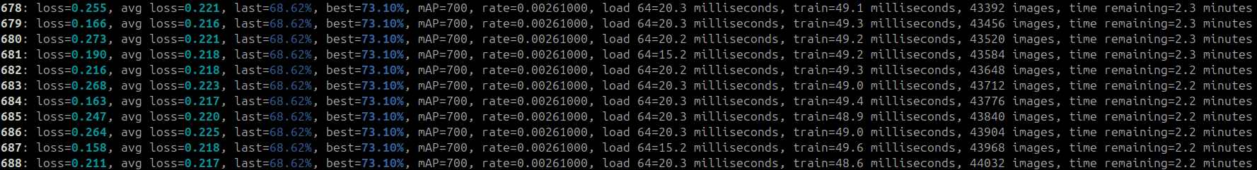 | last=68.62% | recent mAP | The most recent mAP (mean average precision) value. The higher the number, the better the results. This requires the -map flag to be specified when training. |