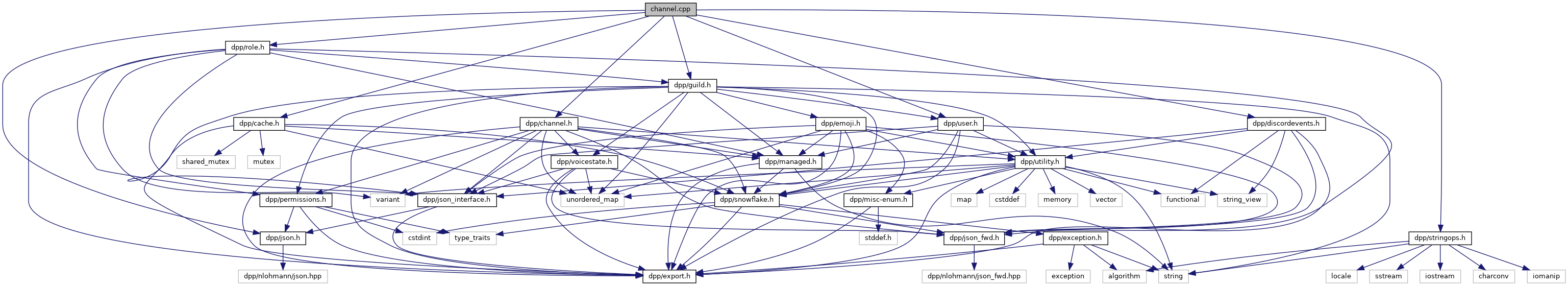 #include <dpp/channel.h>#include <dpp/cache.h>#include <dpp/guild.h>#include <dpp/user.h>#include <dpp/role.h>#include <dpp/discordevents.h>#include <dpp/stringops.h>#include <dpp/json.h>