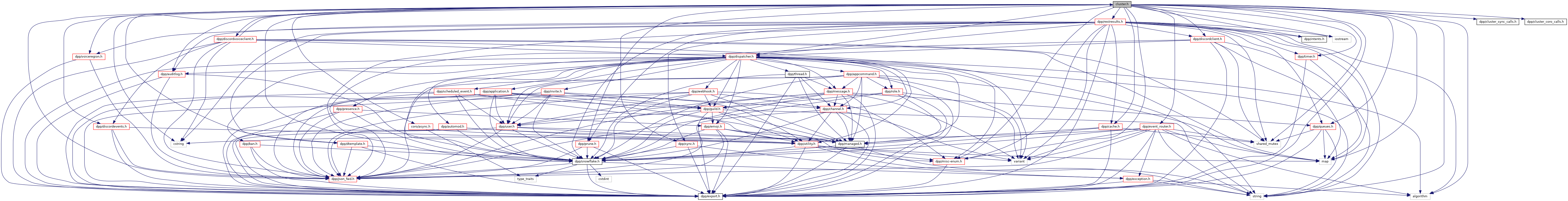 #include <dpp/export.h>#include <string>#include <map>#include <variant>#include <dpp/snowflake.h>#include <dpp/dispatcher.h>#include <dpp/misc-enum.h>#include <dpp/timer.h>#include <dpp/json_fwd.h>#include <dpp/discordclient.h>#include <dpp/discordvoiceclient.h>#include <dpp/voiceregion.h>#include <dpp/dtemplate.h>#include <dpp/prune.h>#include <dpp/auditlog.h>#include <dpp/queues.h>#include <dpp/cache.h>#include <dpp/intents.h>#include <dpp/discordevents.h>#include <dpp/sync.h>#include <algorithm>#include <iostream>#include <shared_mutex>#include <cstring>#include <dpp/restresults.h>#include <dpp/event_router.h>#include <dpp/coro/async.h>#include <dpp/cluster_sync_calls.h>#include <dpp/cluster_coro_calls.h>