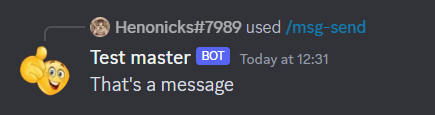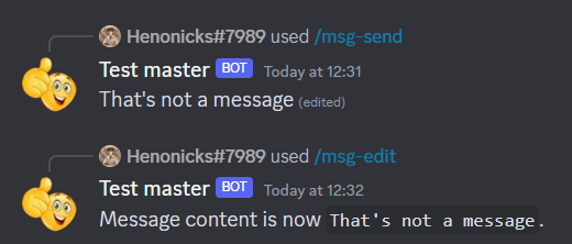 Here we send a message and edit it after. To do so, we first reply to the command msg-send with some text, "This is a message" in our case. As described above, on the next step the message object is taken and the text is replaced with whatever the user desires.